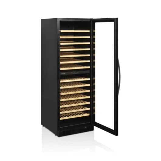 Serija vinskih vitrin TFW brez okvirja je elegantna možnost za shranjevanje in razstavljanje steklenic vina. Vitrine imajo elegantna steklena vrata od roba do roba in izvlečne lesene police, ki omogočajo enostaven dostop. Bela LED-osvetlitev in črna notranjosti vitrine poskrbita, da so steklenice vina elegantno razstavljene. Poleg ekskluzivne zasnove ima vinska vitrina tudi sodoben hladilni sistem, ki zmanjšuje toploto, hrup in porabo energije. Ta model ima dve temperaturni območji, ki ju lahko nastavite tako, da je med njima največ 10 °C temperaturne razlike, kar pomeni, da lahko v enem območju npr. hranite belo vino pri temperaturi 7 °C, v drugem pa rdeče vino pri temperaturi 17 °C.